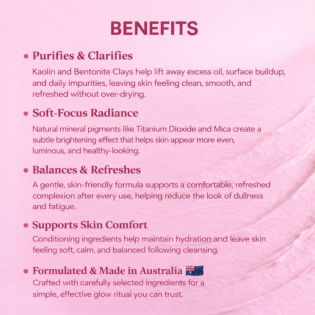 This mask helps purify the skin by lifting away excess oil, surface buildup, and daily impurities using Kaolin and Bentonite clays. Mineral pigments such as Titanium Dioxide provide a soft-focus glow.